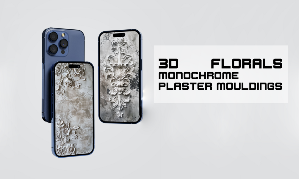 10 monochrome (9:16) wallpapers of thick, 3D floral plaster moulding textures in 4K resolution, optimized for mobile devices.