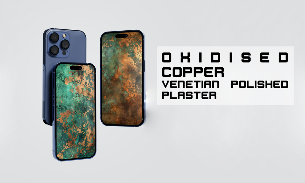 10 opulent (9:16) wallpapers of oxidised copper metallics in Venetian polished plaster textures in 4K resolution, optimized for mobile devices.